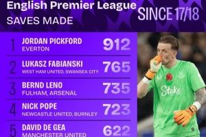 17-18赛季至今英超门将扑救榜:皮克福德912次居首 法比安斯基第二