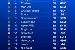 天空体育预测本赛季英超最终排名(积分为模拟10万次的平均值)